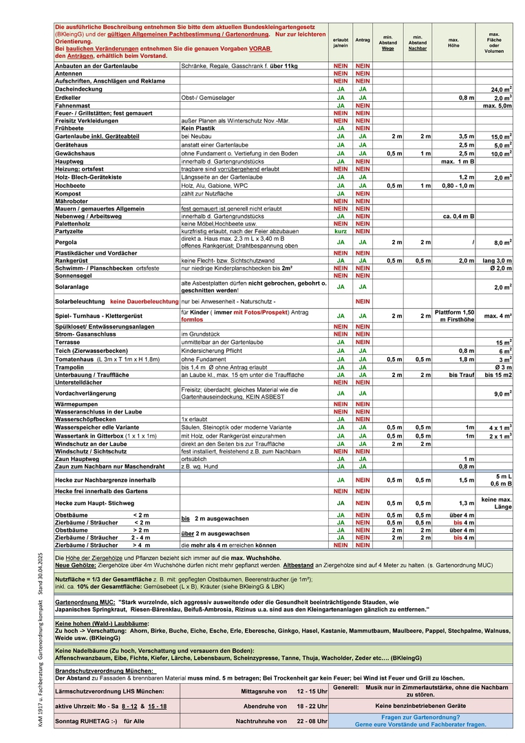 Hier eine Kurzversion der Münchner Gartenordnung und Beschlüsse der Generalversammlung des Stadtverbandes München, mit allen aktuellen Erlaubnissen, Verboten, Maßen und Abständen, die uns der Stadtverband München zur Verfügung gestellt hat.