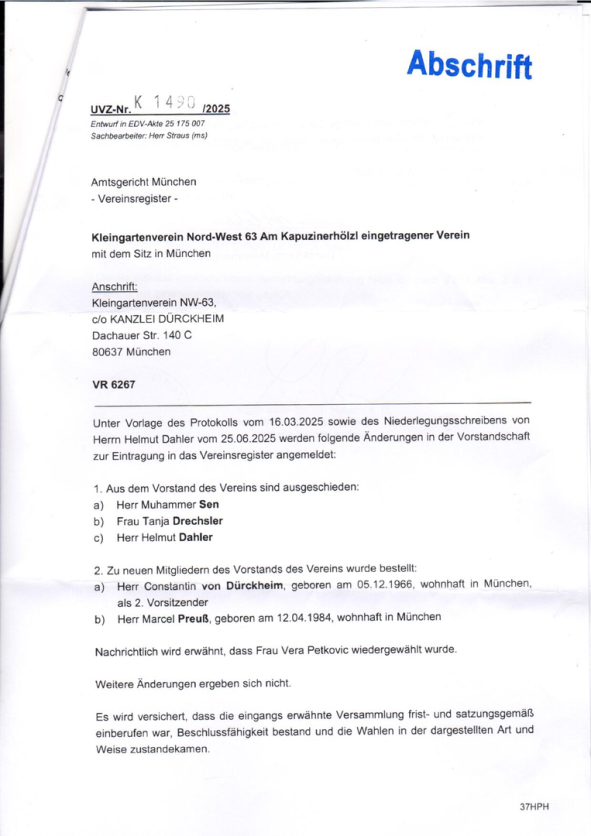 1. Schriftführerin: Patrizia Schmidt, Email: 1.schriftführer@kgv-nw63.de